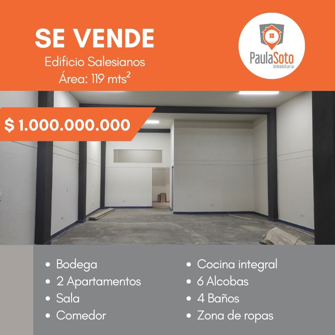 SE VENDE EDIFICIO B/SALESIANOS: Piso1. Bodega de 5 Mts frente X 17 Mts fondo, 4.50 Mts de alto, 1 baño. Zona de ropas. Piso 2. Apartamento sala comedor, cocina integral, 3 alcobas, baño social, baño privado, zona de ropas. Piso 3. Apartamento sala comedor, cocina integral, 3 alcobas, baño social, baño privado, zona de ropas. ÁREA: 7 Mts de frente X 17 Mts de fondo. $1.000.000.000